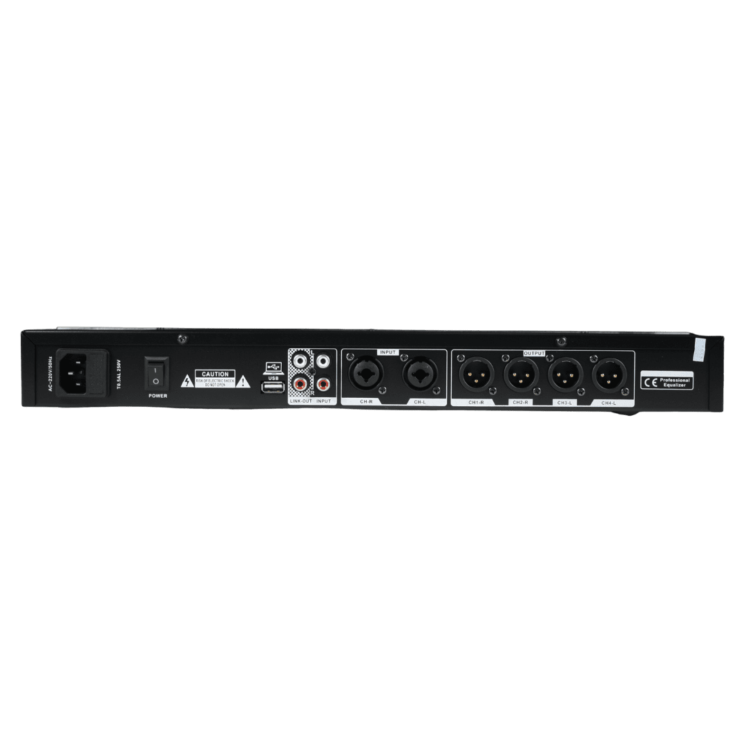 Equalizer 31-band untuk kontrol frekuensi yang akurat, dengan gain ±12 dB dan respons 20 Hz–20 kHz. Memiliki SNR 92 dB, input 15 kΩ, serta output 300 Ω. Ideal untuk tuning sistem audio live maupun instalasi venue.
