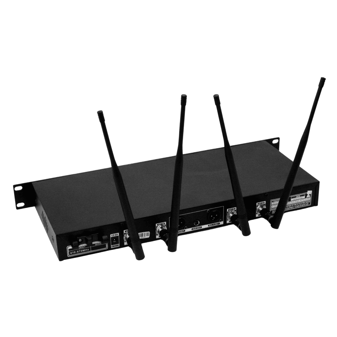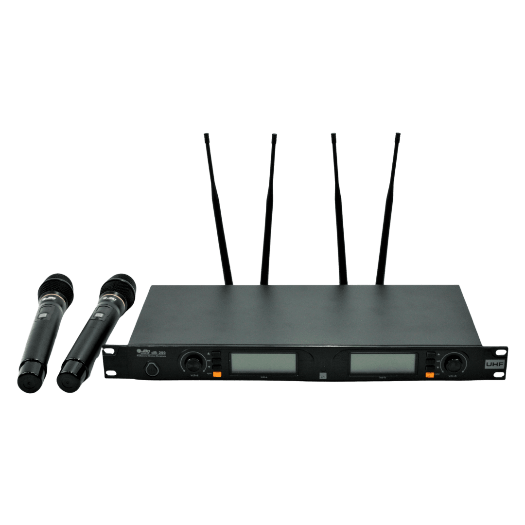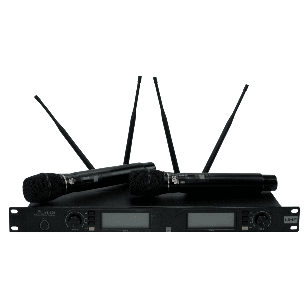 UHF profesional wireles microphone system dengan dual-channel receiver dan jangkauan hingga 100 meter, dengan dynamic range >100 dB serta distorsi <0.5%. DB-200 menyajikan suara yang jernih dan stabil, cocok untuk panggung besar, conference dan instalasi audio profesional.