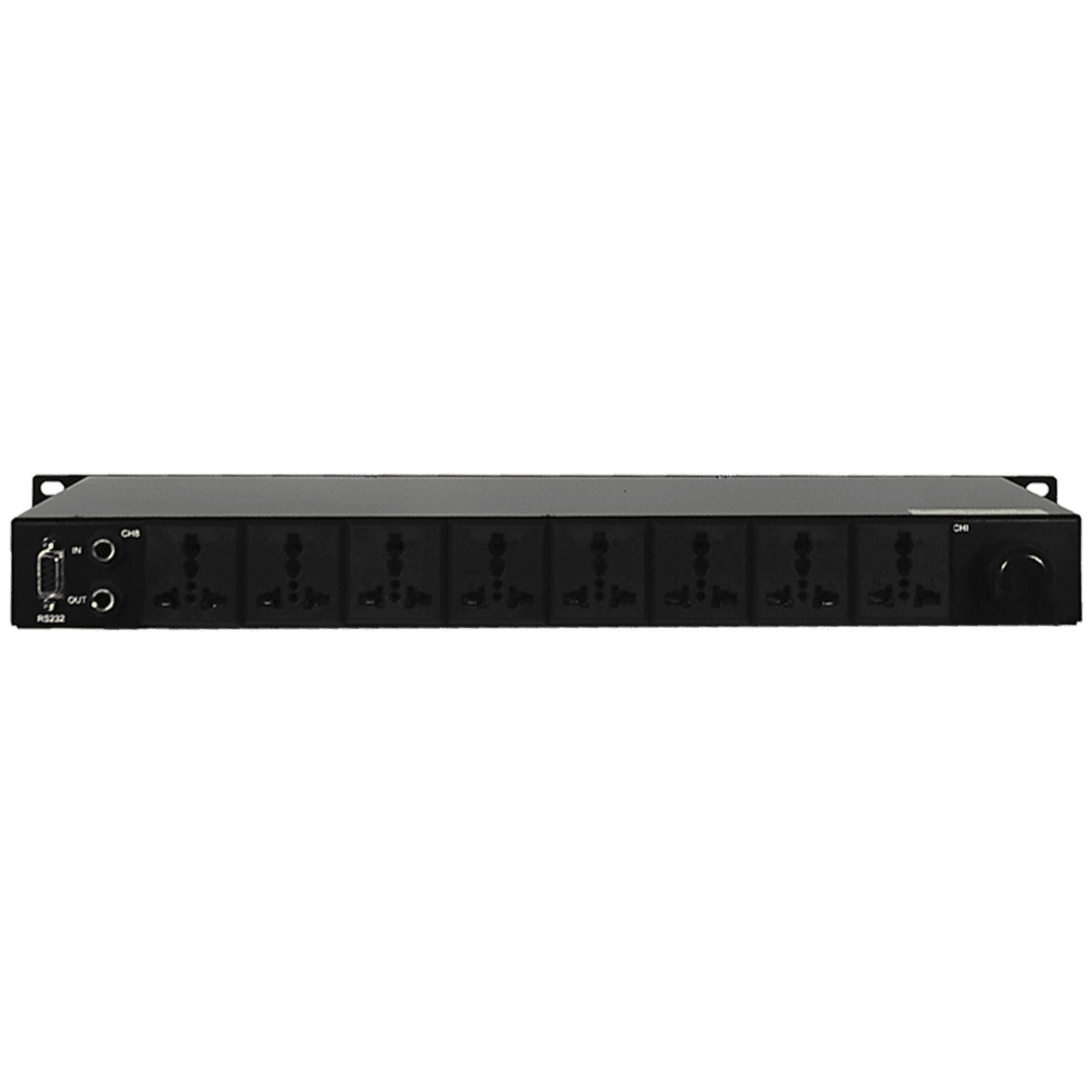Sequencer pintar dengan LED display 2 inci, pengaturan delay 0–999 detik, output 13A per channel dan proteksi over/undervoltage. Total power 600W, koneksi RS232 dan 8 switch output. Cocok untuk kontrol listrik sistem audio skala besar.